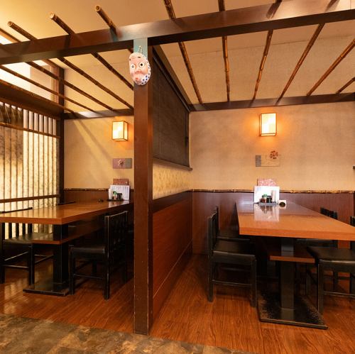 和テイストの落ち着いた雰囲気が漂う店内で、木の温もりを活かした内装と心地よい照明が、リラックスしたひとときを演出します♪テーブル席や掘りごたつ席を完備し、少人数から大人数の宴会まで幅広く対応可能です!掘りごたつ席は半個室となっておりますので、プライベートな集まりにも最適です♪